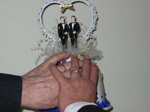Gay WeddingOur first gay wedding, uniting our friends George & Butch. It was all very tastefully done. Instead of a father marching his daughter down the aisle, in this case each family marched their son to the front of the church. It wasn't a "giving away" - it was a "coming together". And, of course, the minister could not say, "in the powers vested in me" or "I now pronounce you man and wife". I think she said, "Partners for life".