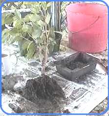 ![]() | Now we seat the cutting in it's bonsai pot. Dip the root ball in water, and spread it over the dirt covered mound, then pack with more dirt making sure it is tightly packed. Water. |