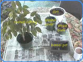 ![]() My own favorite is ficus. I have a large ficus tree, which is trimmed each spring when set outside. The clipped branches are thrust into a quiet corner of the garden where they will either root or die. In the fall, I dig out the rooted "bonsai" ficus and bring them inside to be planted in shallow pots. They take well to pruning; in fact they must be pruned often because their natural desire is to grow back into large ficus trees. I keep my bonsai ficus in a shallow bowl with an arrangement of rocks and ground cover. |