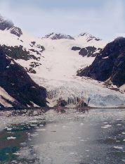 We rented a car at the airport in Achorage and drove to Seward . It was an easy drive and there was plenty of time for stops at the Portage and Exit Glaciers. At Portage there is a junction with the railroad, where those can board who wish to ship themselves and car through the railroad tunnel to Whittier. Further on one approaches the Portage glacier itself, which is hidden from view by a ridge of mountain; there is a small museum there, and boat rides are offered for a close look at the glacier. The glacier museum is small and pleasant and there is a walkway to water's edge. We also saw a display of ice worms in the museum, a subject of great interest since seeing "Smilla's Sense of Snow", a movie whose plot turns on the existance of ice worms. Along the access road to the glacier there are a number of small parks. We pulled off into one to eat our lunch (sandwiches and fruit we'd picked up at a supermarket in Anchorage before setting out) and enjoy a spectacular view of Mountain and lakelet with beaver dam and ducks.
