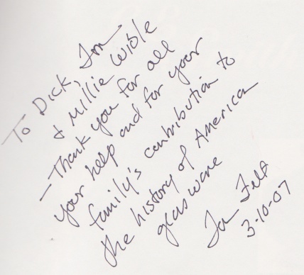 We were also pleased to support the Mt. Pleasant Glass Museum with donations of a portrait of Shorty, a copy of Tom Felt's "L. E. Smith Glass: The First Hundred Years," a Lincoln Zephyr lens (photographed upside-down in the Felt book;-) and a 16mm print of an early '60s promotional film, The Story of Glass. With the demise of the museum, the film was donated to the Heinz History Museum in Pittsburgh.