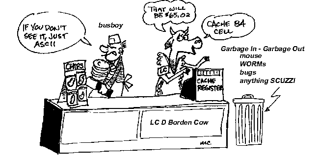In 1983, the Apple Pitts (Pittsburgh's premier Apple user group) had a contest for the best food/computer puns. The result is "Take a Byte at the Apple Cafe". Reading it now, 20 years later, reminds me of the state of the art at that time. Some have no relevance today- for instance, we ued PEEK and POKE a lot in subroutines. No one uses a notcher anymore. When we refer to an LCD screen, we mean something very small. Pull down menus were a new feature.