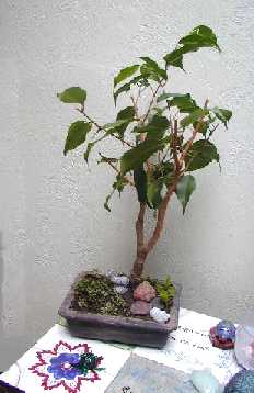 ![]() My own favorite is ficus. I have a large ficus tree, which is trimmed each spring when set outside. The clipped branches are thrust into a quiet corner of the garden where they will either root or die. In the fall, I dig out the rooted "bonsai" ficus and bring them inside to be planted in shallow pots. They take well to pruning; in fact they must be pruned often because their natural desire is to grow back into large ficus trees. I keep my bonsai ficus in a shallow bowl with an arrangement of rocks and ground cover. |