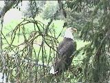 One afternoon, while sitting in the livingroom, we saw an eagle swoop over the porch and settle on a tree just in front of it. A photo opportunity! I grabbed my camera and began taping through the glass door, then Carl slid it open and I sidled out (using my best tai chi creep) trying to get the best view of the eagle that I could without scaring it away. The tape ran as I crept closer and closer to the porch railing and the tree. The eagle eyed me, but did not move. Soon I said to Carl, who had followed me out, "I'd like to get tape of him flying away ---" Carl clapped his hands, crying out "shoo, shoo" but the eagle did not move. The others came out, in a less quiet fashion and still he did not move. I taped him from a distance of 12 or 15 feet for about 10 minutes. Finally -- his own idea -- he flew down the slough. Seeing such a large, magestic, wild bird up so close was a thrill. Someone said that when the salmon were running, the eagles were as common as starlings. Helen reported that a few weeks after we left, she saw two eagles lock talons and spiral to earth, hitting the mud flats below her house. She and a neighbor ran out, to see if either bird was hurt by the fall. But they both got up and continued their flight/pursuit down the slough. Was it a territorial dispute or a mating ritual? She doesn't know. |