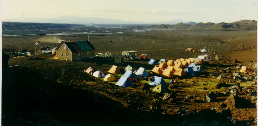 This is how the town records describe Eyvindur: "He has a happy disposition, athletic, an excellent swimmer and wrestler, fast on his feet beyond compare, especially on the steep slopes and so expert at hand-running that he is faster than the swiftest horse. He is tall and thin, with large hands and feet. He has blond curly hair and wears a moustache. He is agreeable in manner, well-groomed and clean, a skilled craftsman in wood and metal, able to read a little but cannot write at all."What is hand running? It is running, using the arms and knuckles as a second pair of legs, like a horse or dog would run. No one in Iceland can do it now, but in the days before roads and wagons, many young men could hand-run. Halla and Eyvindur were forced to leave their farm and become outlaws. Some people say that Eyvindur was caught stealing a rope and ran away to escape hanging. Others say that Halla killed a boy who was working for them. Halla wanted to burn their house down so that people would think they were dead but Eyvindur would not let her do it. They left their children behind. One daughter, named Olof, ran to the next farm, and so the children were saved from starving. Halla and Eyvindur first moved into the hills above the sheep farms. They built a hut near a hot spring, and stole sheep. They cooked the sheep in the boiling water of the spring. After a while the farmers noticed that some sheep were missing and went to capture the outlaws. Eyvindur escaped by hand-running but Halla was captured and taken to the settlement. The next winter Eyvindur had a very hard time. He caught wild birds and ate them raw. In the spring, Halla escaped from the town and joined Eyvindur and they moved to another area where again they built a hut of stones and sod, near to a spring. They lived there for 5 years, stealing sheep and other things from the farmers. Again, the farmers followed the sheep tracks and discovered Eyvindur and Halla's hut. Eyvindur and Halla had a narrow escape and just had time to bury their tools in a swampy place and run away to some lava caves. The farmers burned the hut and took back the sheep, but they did not catch the outlaws. The next winter, they were very hungry. Eyvindur was saying his prayers, but Halla said that would do no good. Then Eyvindur looked out the door, and there was a horse! They killed the horse and ate it, raw, all that winter. They used the skin as a door to their hut.